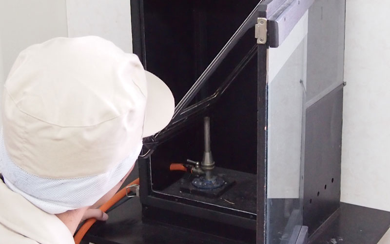 厨房やコンロでの使用を前提にした燃焼耐久試験装置です。45°ミクロバーナー法に準じた燃焼試験を行えるようになっております。